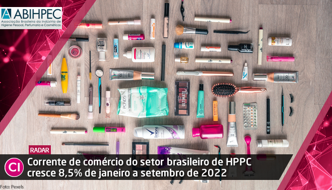 O setor brasileiro de Higiene Pessoal, Perfumaria e Cosméticos apresentou um crescimento de 8,6% na corrente de comércio internacional no consolidado de janeiro a outubro de 2022, em relação ao ano passado. De acordo com análise da Associação Brasileira da Indústria de Higiene Pessoal, Perfumaria e Cosméticos (ABIHPEC), o percentual representa a cifra de US$ 1.26 bilhão, e um saldo da balança comercial do setor, superavitário em US$ 37 milhões, revertendo o saldo deficitário registrado no mesmo período de 2021 (US$ – 1.9 milhão).
