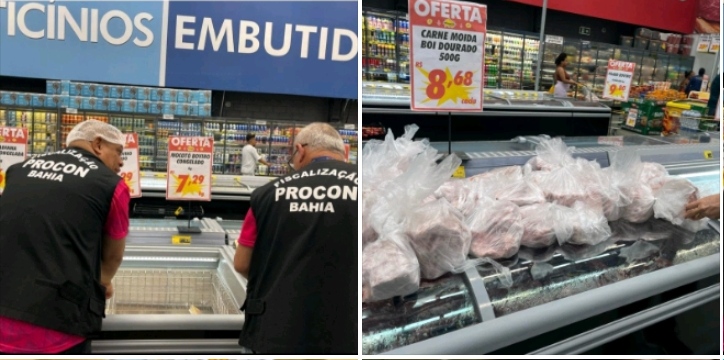 Foram retirados de circulação 91 quilos de carne imprópria para consumo e identificadas 1.880 unidades de produtos com prazo de validade vencido no Mineirão Atacarejo. Publicidade enganosa e 3.332 itens sem preço foram as irregularidades encontradas no Mercantil Rodrigues.
