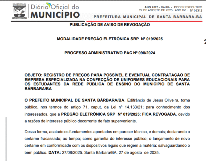 Em 27 de agosto de 2025, o Diário Oficial trouxe a revogação do pregão, considerada pela administração como “fracassada”, sob a justificativa de “razões de interesse público decorrente de fato superveniente”. O cancelamento deixou a comunidade escolar apreensiva, pois significava, em tese, que os estudantes permaneceriam sem os kits.