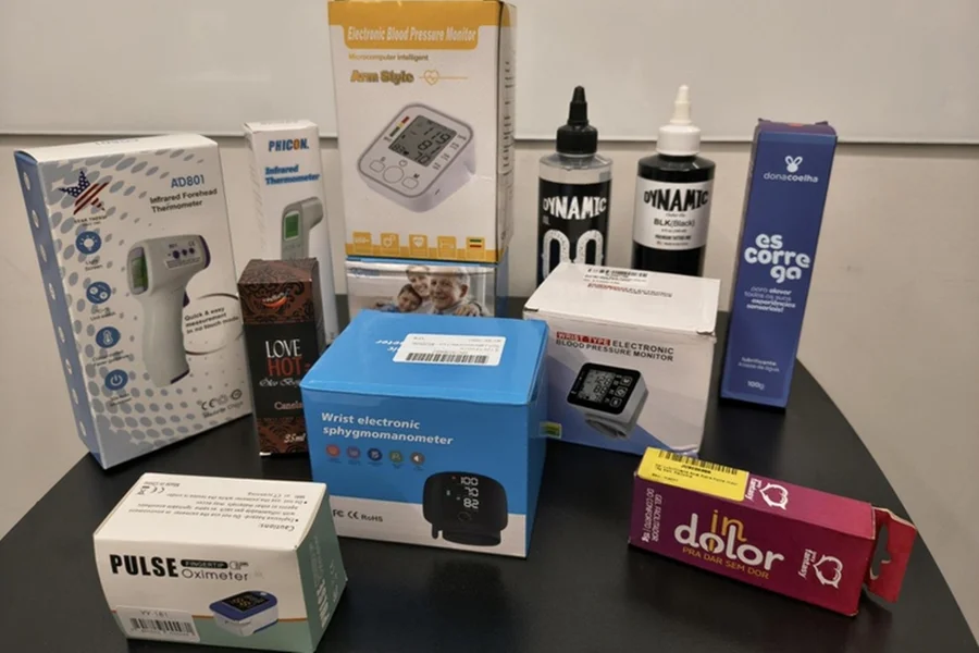 Entre os itens apreendidos estão medidores de pressão, termômetros, oxímetros, tintas para tatuagem, lubrificantes íntimos, suplementos alimentares e probióticos. Ao todo, mais de 1,6 mil aparelhos de pressão foram retidos, além de centenas de outros produtos.